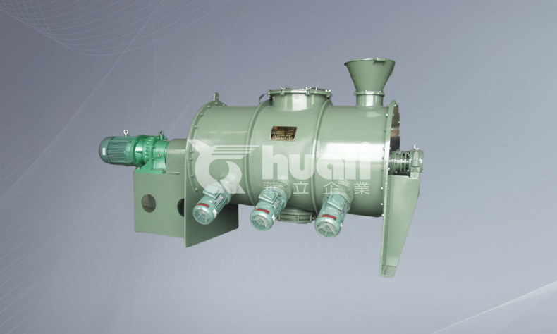 混合機開動后犁刀繞軸旋轉(zhuǎn),帶動物料沿筒體徑向作周向湍動,同時把物料沿犁刀兩側(cè)面的法線方向拋出。當(dāng)被拋出和作周向湍動的物料流經(jīng)飛刀組時,被高速旋轉(zhuǎn)的飛刀迅速、有力地拋散。物料在上述犁刀和飛刀的復(fù)合作用下,不斷更換、擴散、在較短時間內(nèi)達到均勻混合,混合精度較高。對需要固-液混合的物料,混合液體通過噴液裝置均勻噴灑在筒體內(nèi)運動的物料上。